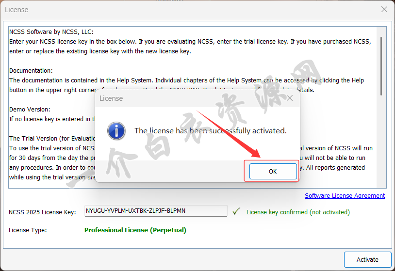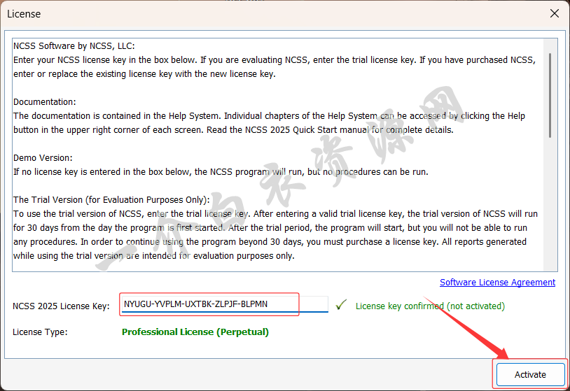 15.将第13步复制的密钥粘贴到“NCSS 2025 License Key”处,点击【Activate】