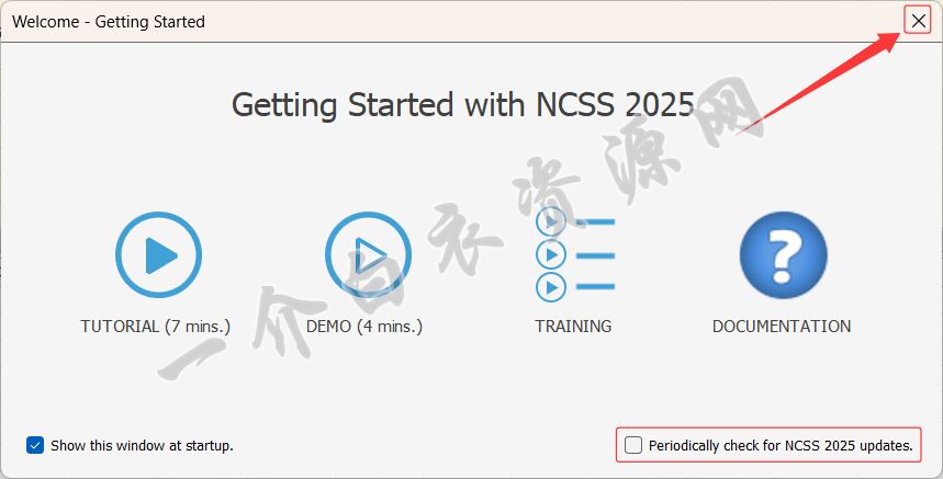 17.取消勾选【Periodically check for NCSS 2025 updates】,点击右上角【X】,关闭此窗口