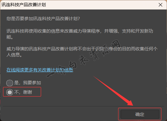 13.勾选【不,谢谢】,点击【确定】