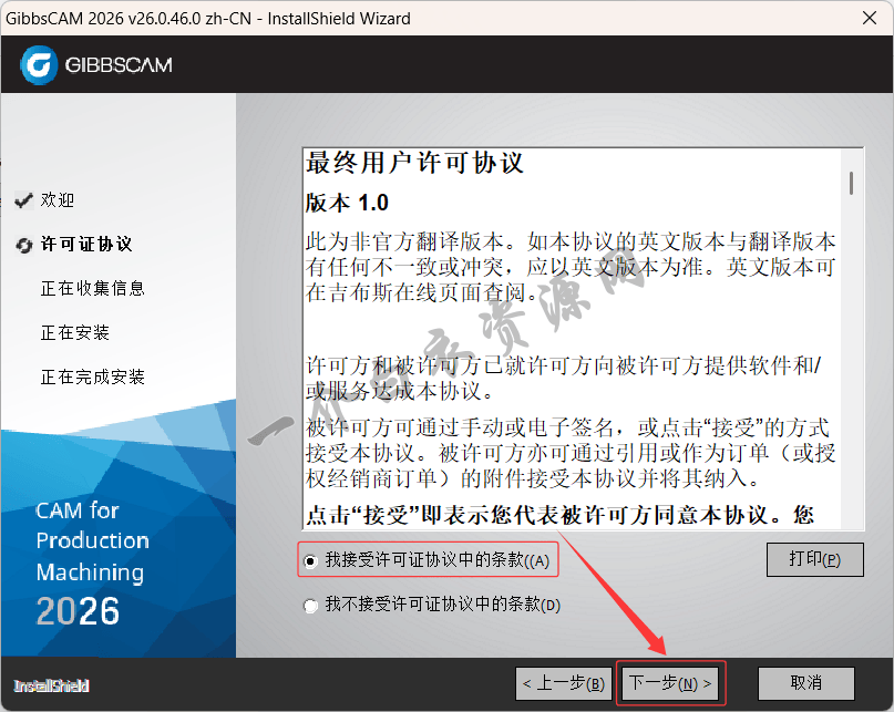 10.勾选【我接受许可证协议中的条款】,点击【下一步】