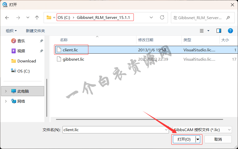 17.定位到C盘【Gibbsnet_RLM_Server_15.1.1】文件夹中的【client.lic】文件,点击【打开】