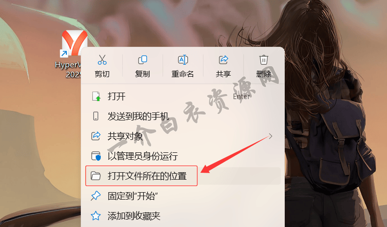 25.右键点击刚才拖拽至桌面的HyperView 2025软件图标,选择【打开文件所在的位置】