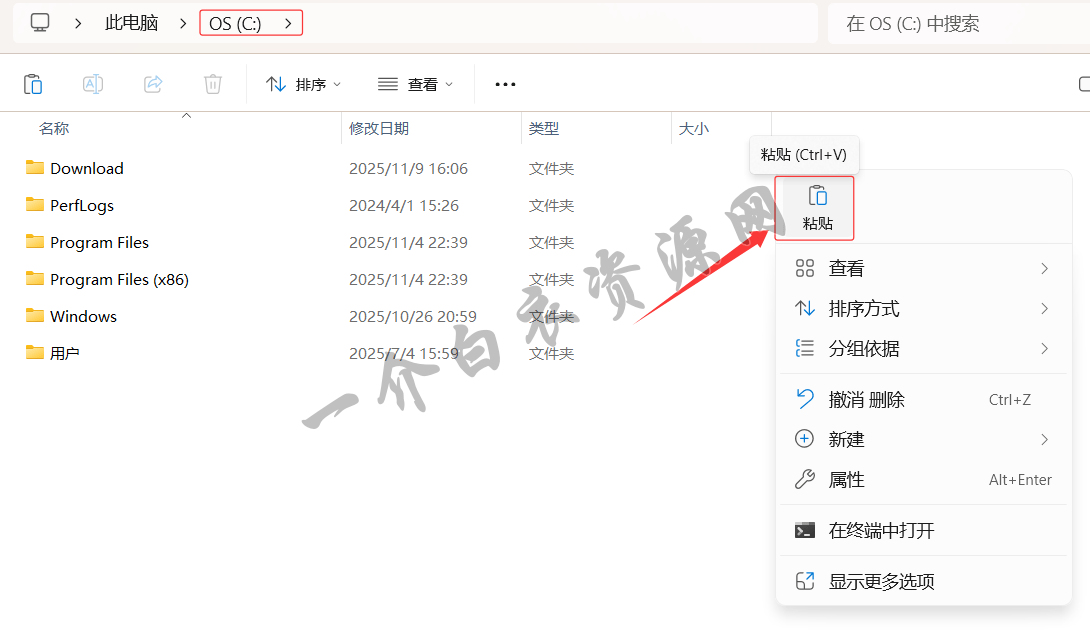 7.打开C盘,在空白处点击右键,将上一步复制的文件夹,粘贴到C盘