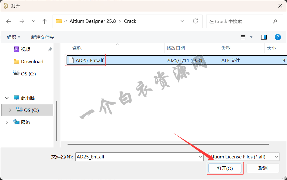 20.定位到安装包【Crack】文件夹内的【AD25_Ent.alf】文件,点击【打开】