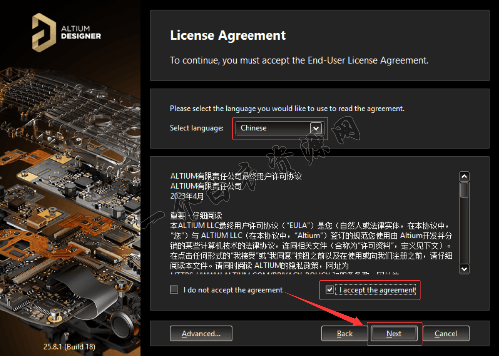 5.将Select Language调整为【Chinese】,勾选【I accept the agreement】,点击【Next】